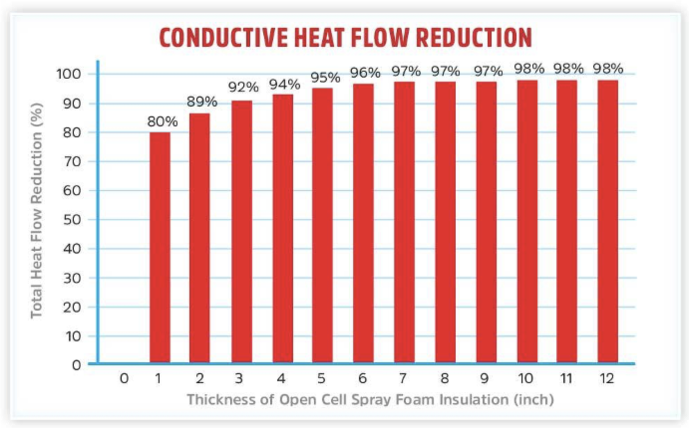 The following is a graphic of the thermal efficiency of open-cell spf per inch of coverage. Closed-cell foam is a denser foam and one inch of closed-cell would produce equivalent energy ratings of 1.7 inches of open-cell foam or approximately 3 inches of closed-cell foam to get energy efficient ratings in excess of 95%. In addition, closed-cell foam is highly water and flood resistant whereas open-cell foam is not and would lose its insulating values if wet.