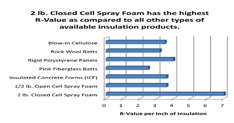 After reaching 94% efficiency, the incremental gains in efficiency or insulating properties are small compared to the additional material required. The main advantage for additional material for closed cell foam is the increase in racking strength ccSPF, provides. Densities can range from 2-4 lbs./cu ft. and higher, depending on the desired structural strength.