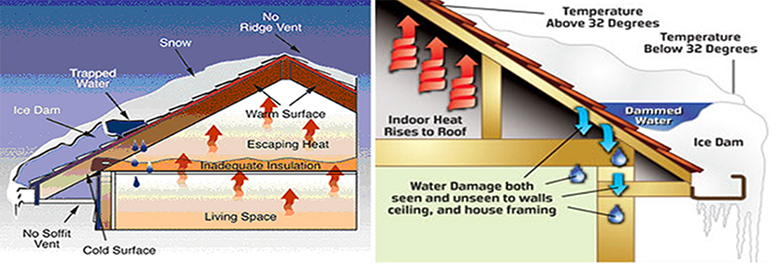 This extreme winter weather puts extra stress on structures by putting abnormal weight on the roofs reducing protection to material and occupants and leaving them with inadequate thermal and convective energy insulation to maintain effective interior comfort. If snow remains on your roof, it is an excellent indication that conditioned air from the interior of the structure is not leaking or escaping through the roof and the resulting energy efficiency of the building is high. A lack of snow on your roof or portions thereof and snow on nearby structures is a sure sign of poor energy efficiency. See below for visual and graphical display of snow melting and water not properly draining.